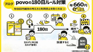 スマホ povoの180日ルール対策|年660円維持の考え方と利用停止を防ぐ方法 povoの180日ルールは「放置すると利用停止になる」仕組みです。本記事では、年660円で維持する方法・起算日の考え方・例外条件・忘れない管理方法までやさしく解説します。失敗せずに保険回線として使いたい方は必見です。 2026.04.14 スマホ