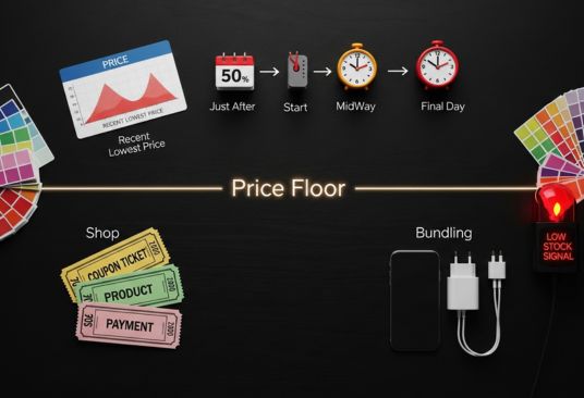 迷ったら、数字に戻す。— 直近3か月の底値ライン、開始直後と最終24hクーポン→商品→決済0.85倍で実質化、色/容量/型番の横展開。この4点セットで十分です。