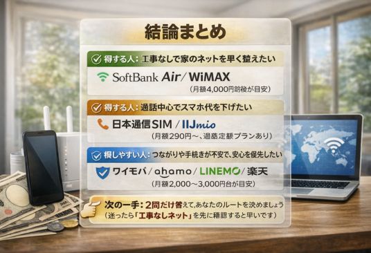 迷ったら、まずはホームルーター(工事なし)で家のネットを整えるのが近道です。家が安定すると、スマホ側の選択もラクになります。