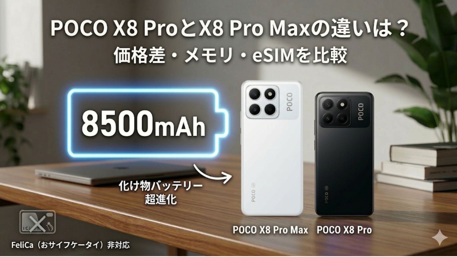 この記事では、POCO X8 ProとX8 Pro Maxの違いを価格・メモリ・eSIM中心に整理します。