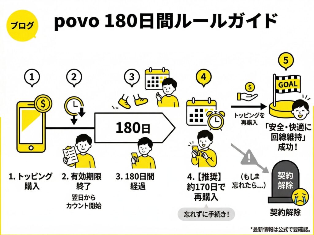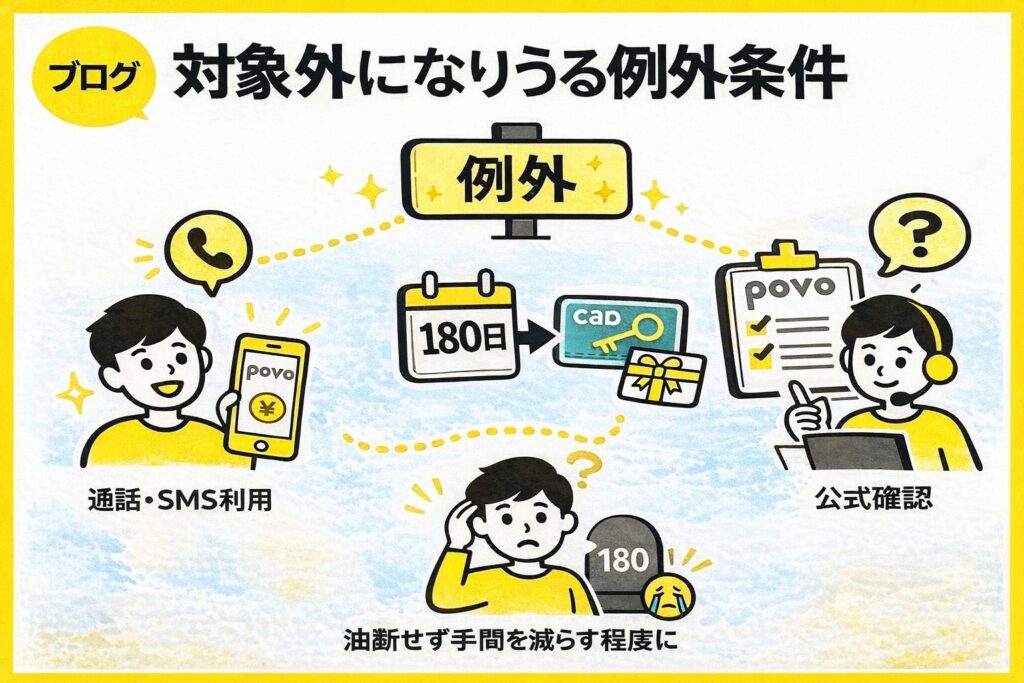 例外条件は「補足」として理解する程度にとどめ、運用の基本は有料トッピング購入に置いておくのが安全です。判断に迷ったときは、povoアプリや公式FAQで最新情報を確認してください。