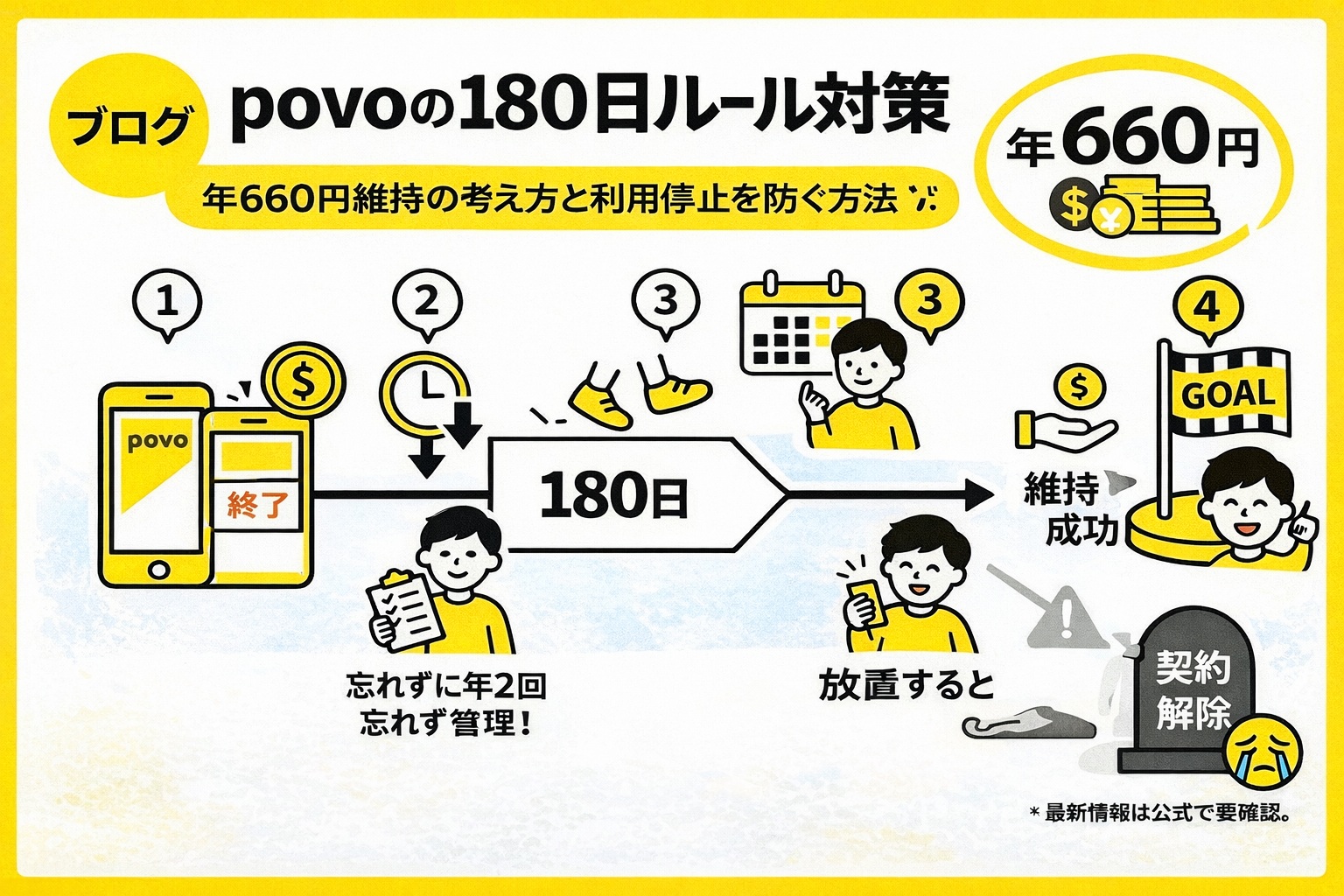povoは「180日ごとに有料トッピングを購入できる人」なら、年660円程度で安全に維持できます。