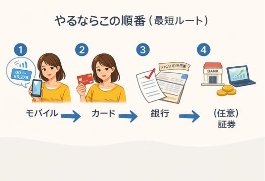 固定費を減らす → 支払いの流れを整える → おまけ(金利・ポイント)を拾う。